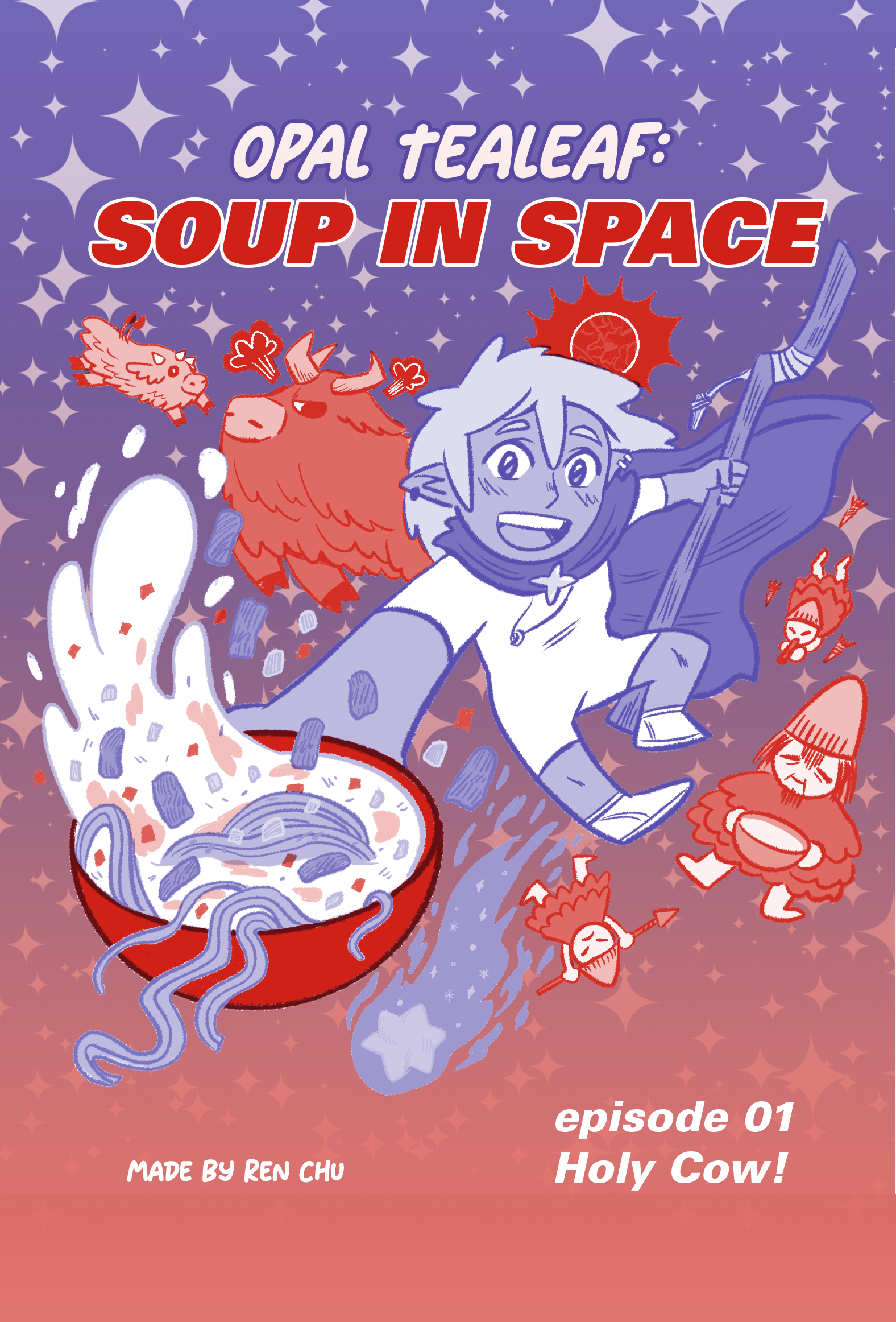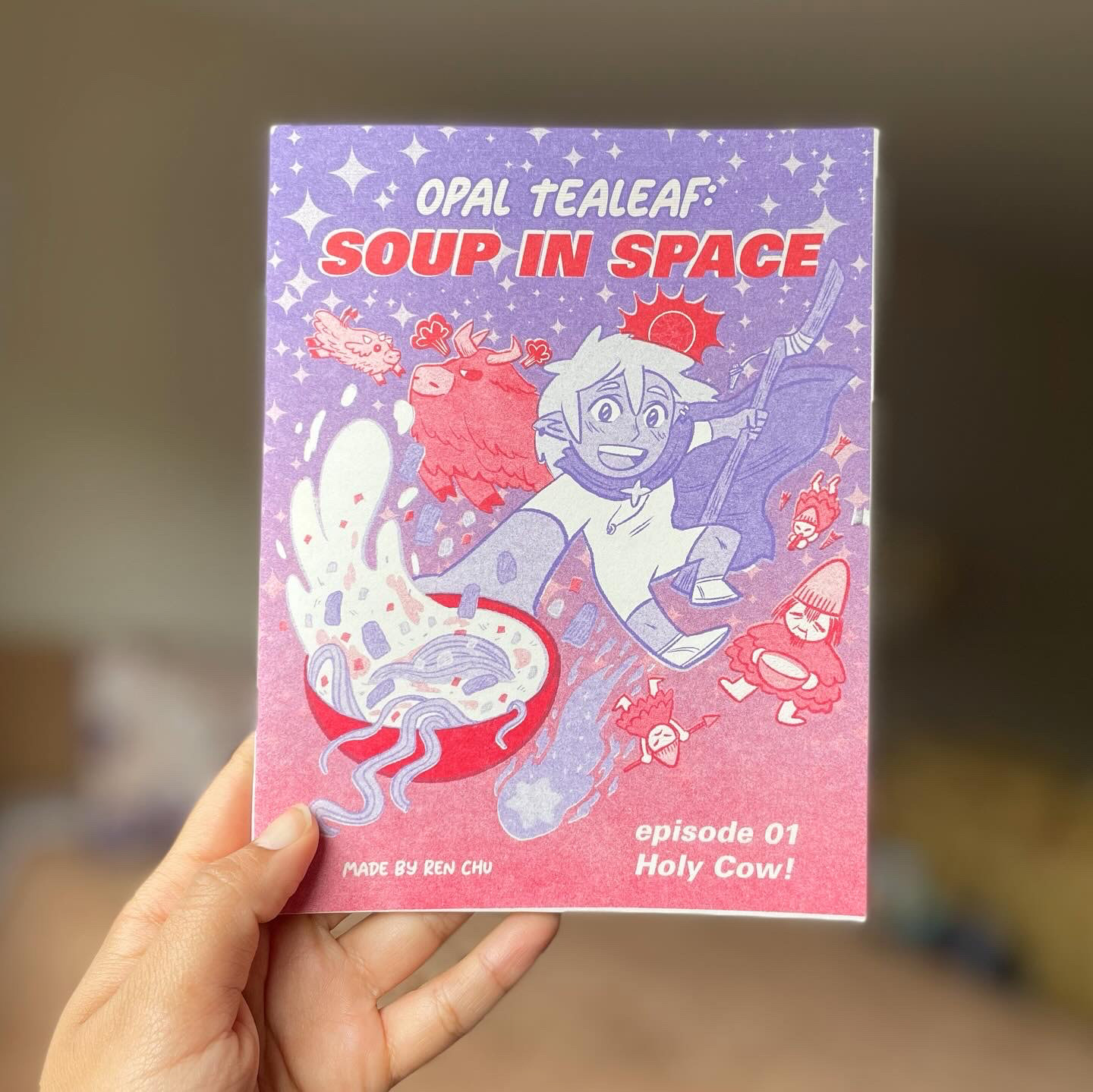 "Opal Tealeaf: Soup In Space" is a 12-page risograph-printed comic book about a halfling monk in space, navigating alien planets while cooking her favorite soups. Each episode contains a real soup recipe at the end tool. Art, story, and comic production were all made by Ren Chu.