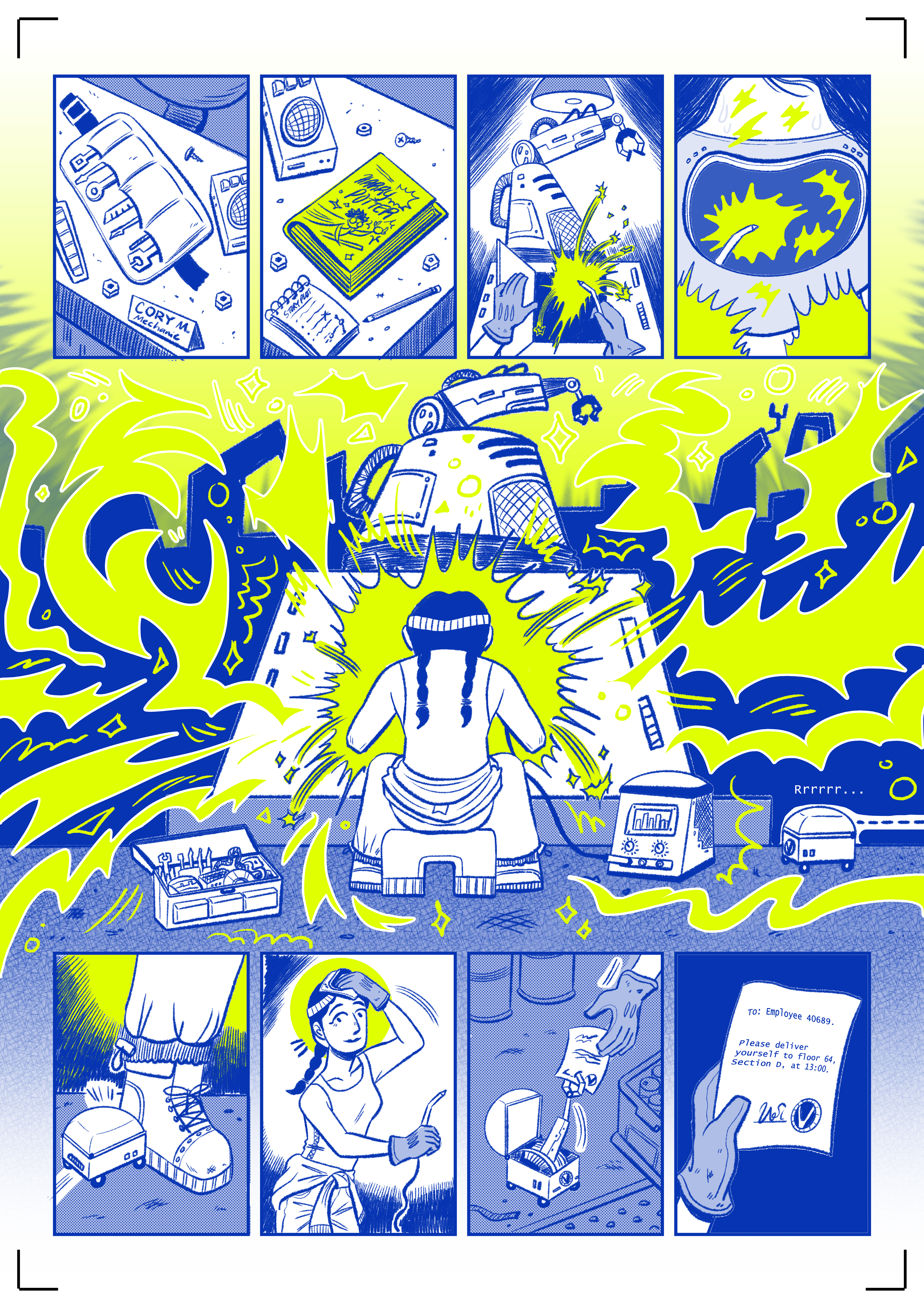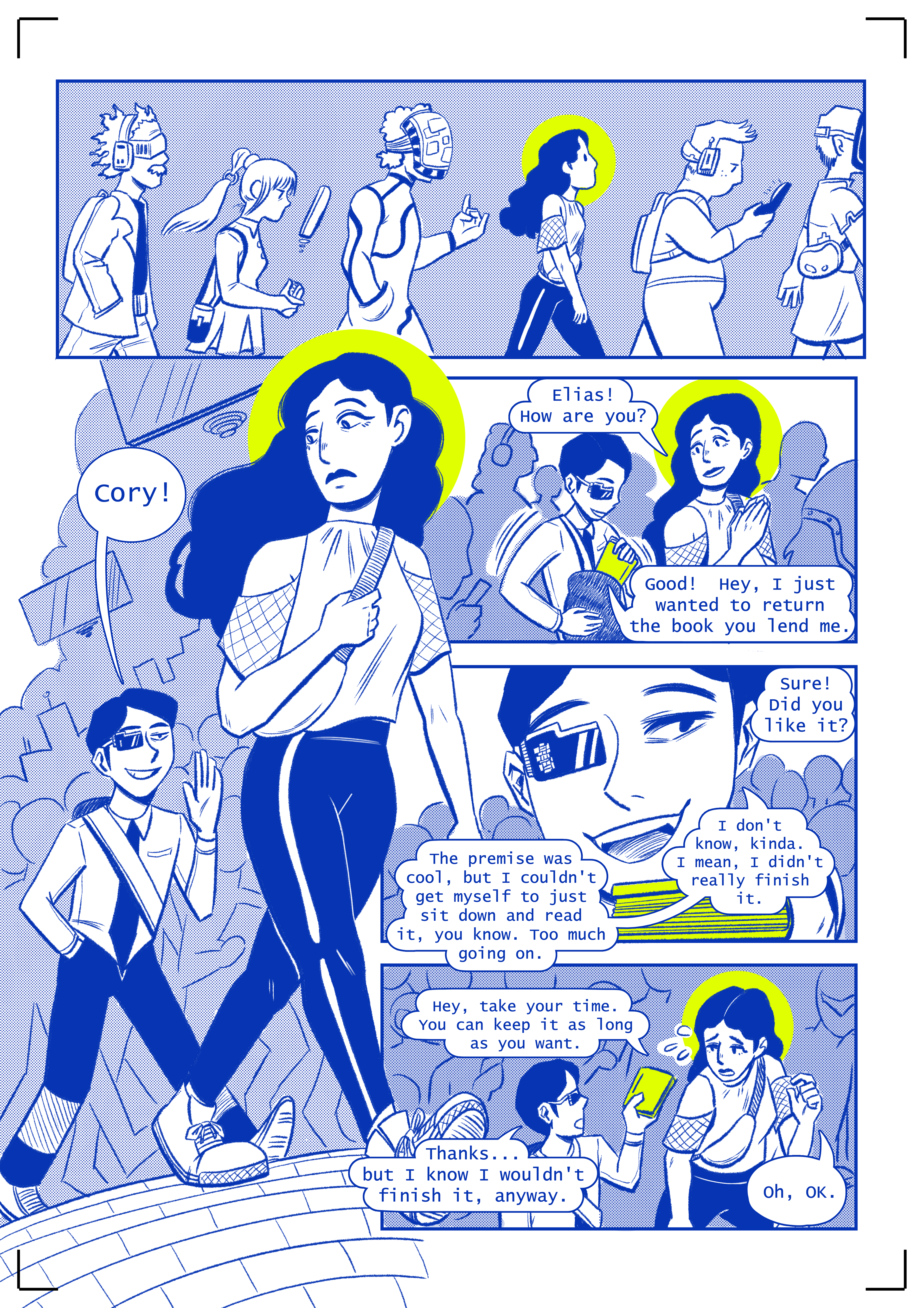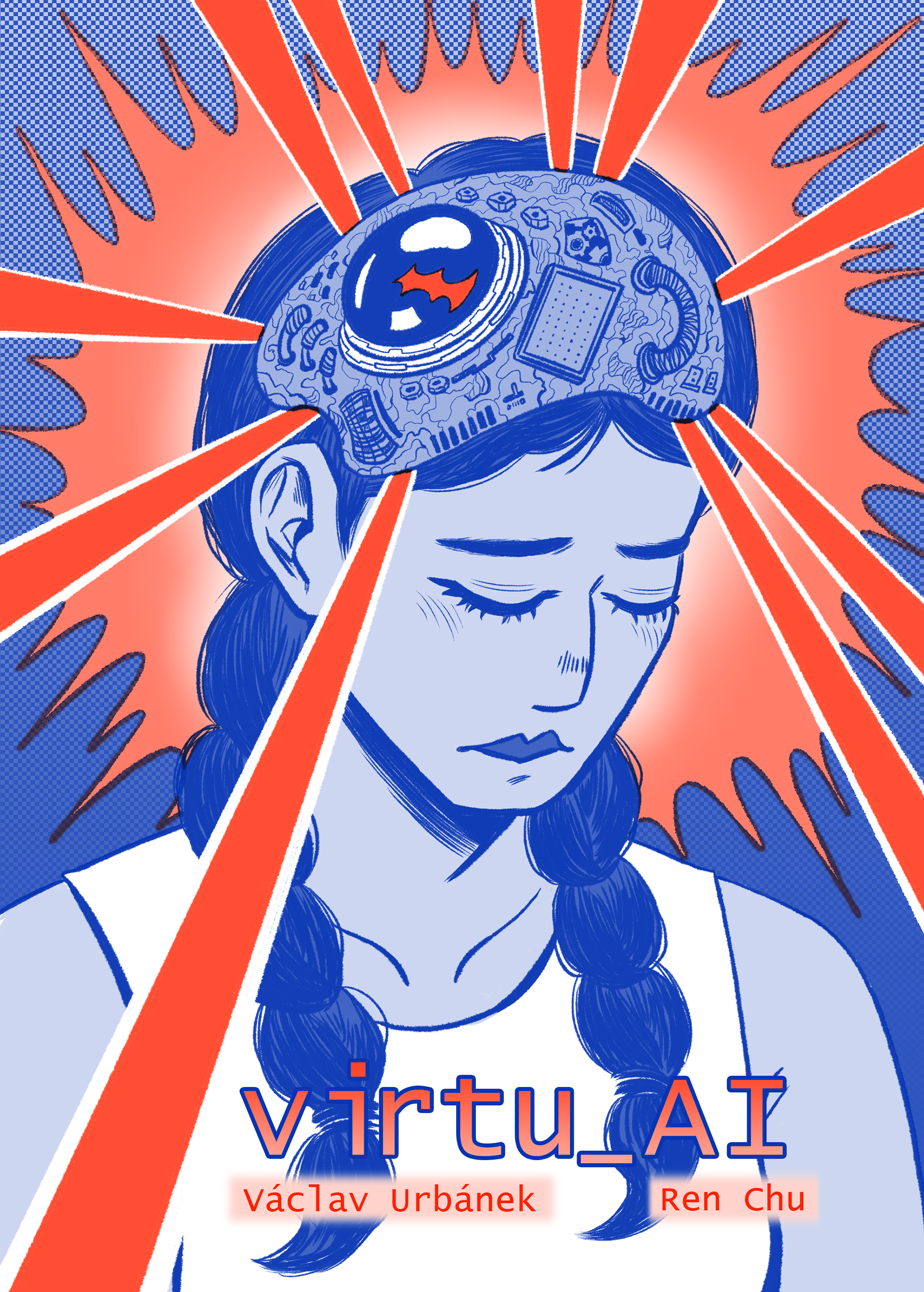 In the year 2095, artificial intelligence and hyper-capitalism have desaturated the world, causing original content to deplete. Virtucore, one of the main mega-corporations of this cyberpunk world, seeks a solution from their three peculiar employees. "Virtu_AI" explores the meaning of creativity and its contrast with the ultra-rich corporate world. This short story is a celebration of the uniqueness of humanity and its pricelessness, even in a cold future. No AI was used during the making of this comic book.